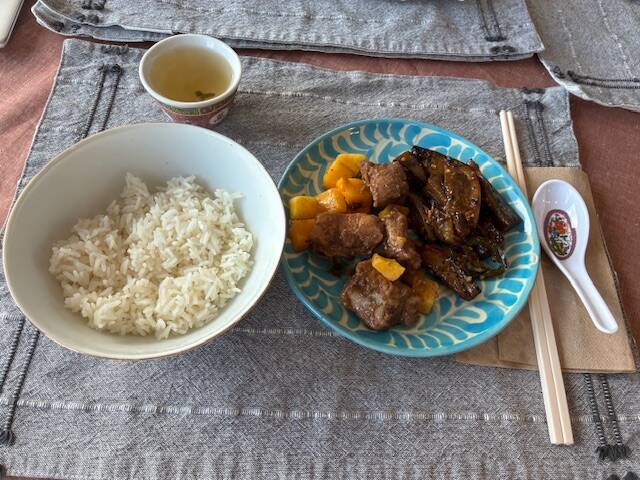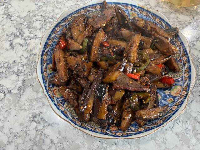 I've been on a Chinese food kick this past week after buying the "House of Nanking" cookbook by Chefs Peter and Kathy Fang (highly recommend!). Their recipe for Szechuan eggplant aligned perfectly with beautiful petite eggplant from the Hood River Farmers Market this weekend (see videos below). Their recipe called for dried red chiles tossed in at the end, but I didn't have any, so I added sliced soy marinated jalapenos and Thai bird chiles (also their recipe) which I had in the fridge from a prior cook; spice and purpose accomplished! I paired it with steamed garlic and black bean spareribs (have your butcher cut regular ribs short for you) with pre-cut butternut squash from the store. To be more seasonal, I could've paired them with cut up pie pumpkin, but to quote my teenage niece, "I ain't got time for that". To add to the fun, I used a tea flowerball in a glass tea pot for hot tea, and steamed white rice, always:)